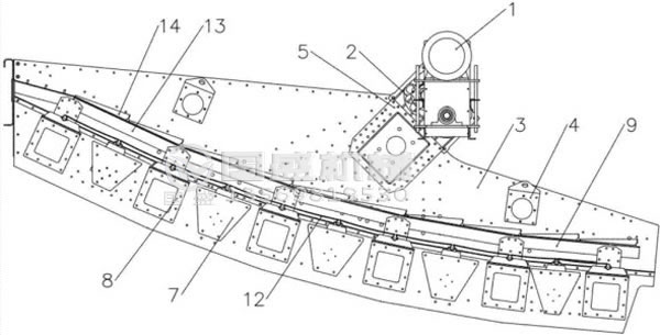 香蕉振动筛主要由筛箱、筛网、激振器、减振弹簧和下座架等组成。它是由电动机和激振器作为振动源,激振器主要是由偏心轴、皮带轮、轴承及轴承座等组成,激振器安装在筛箱侧板上,并由电动机通过三角皮带或软连接与其相连,电动机带动偏心轴旋转,产生离心惯性力,迫使筛箱振动。